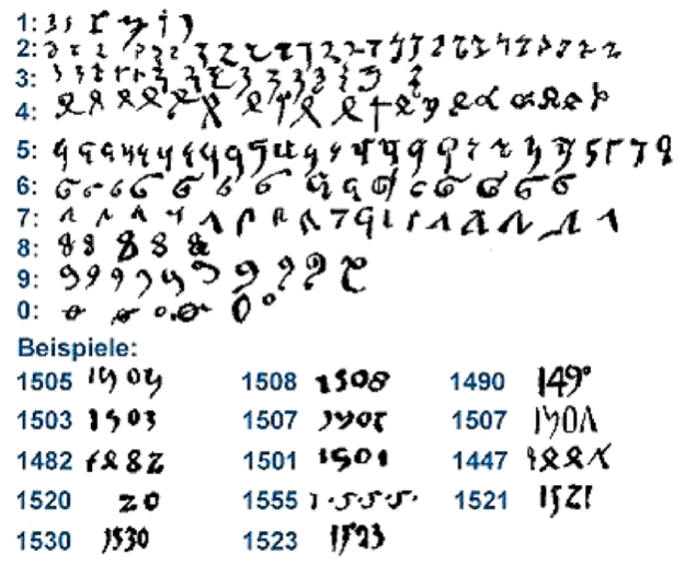 Man merke, es bedeuten die Ziffern fast nur Jahrzahlen von 1450 - 1550. Vor 1450 kommen außer in Handschriften bei uns Jahrzahlen in arabischen Ziffern seltenst vor.